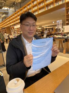 なので、九州大学の情報基盤研究開発センターの元助教で、現在、Darham Universityにいらっしゃる、王先生が代わりに受け取り、それをさらに同センターから参加されていた谷口先生に経由して、賞状を受け取りました。それをさらに私が先日、耿先生と打ち合わせ後、スタバでコーヒーを一緒に飲んでいた時に渡しました(笑)。スタバで授賞式です。